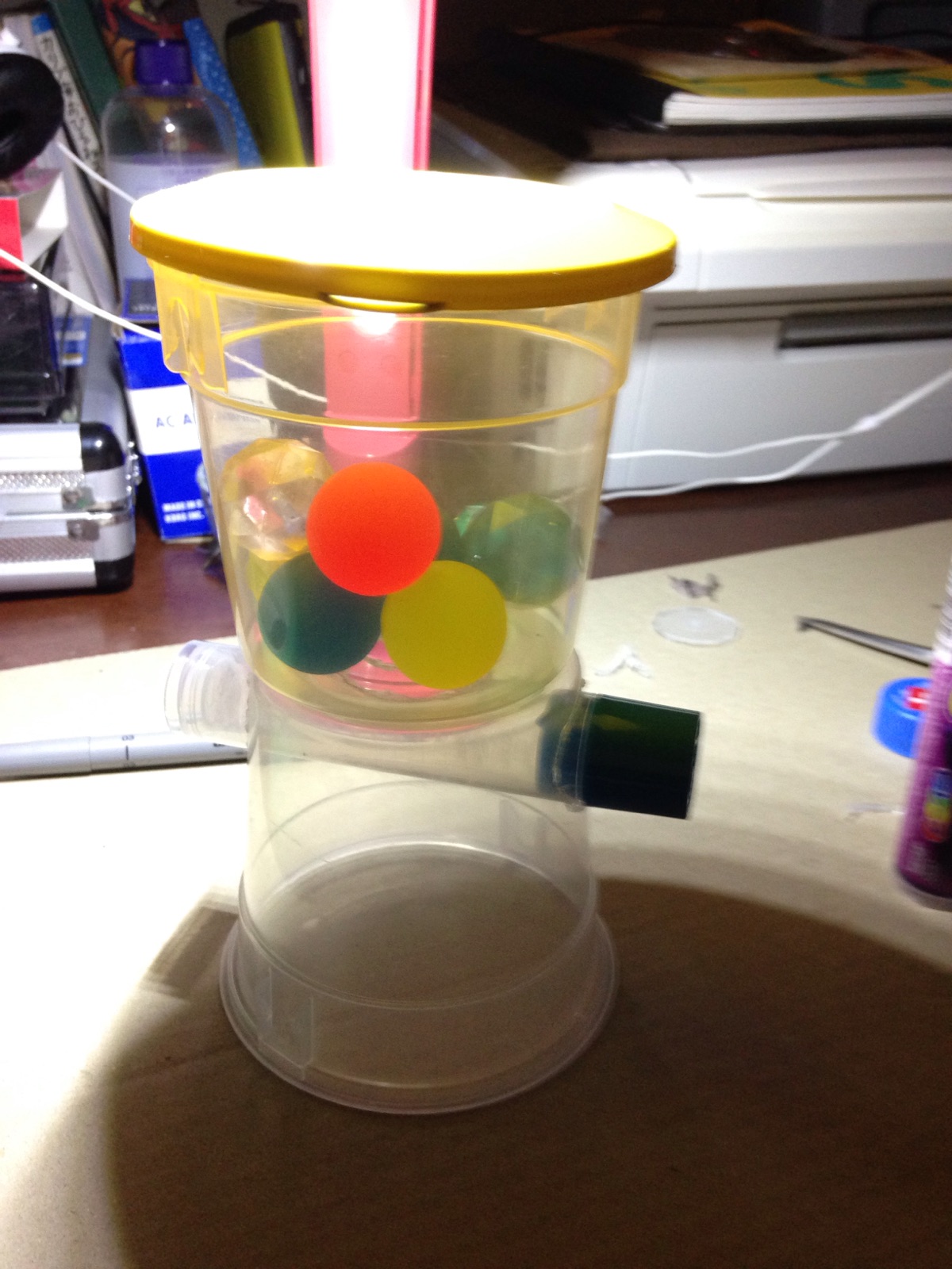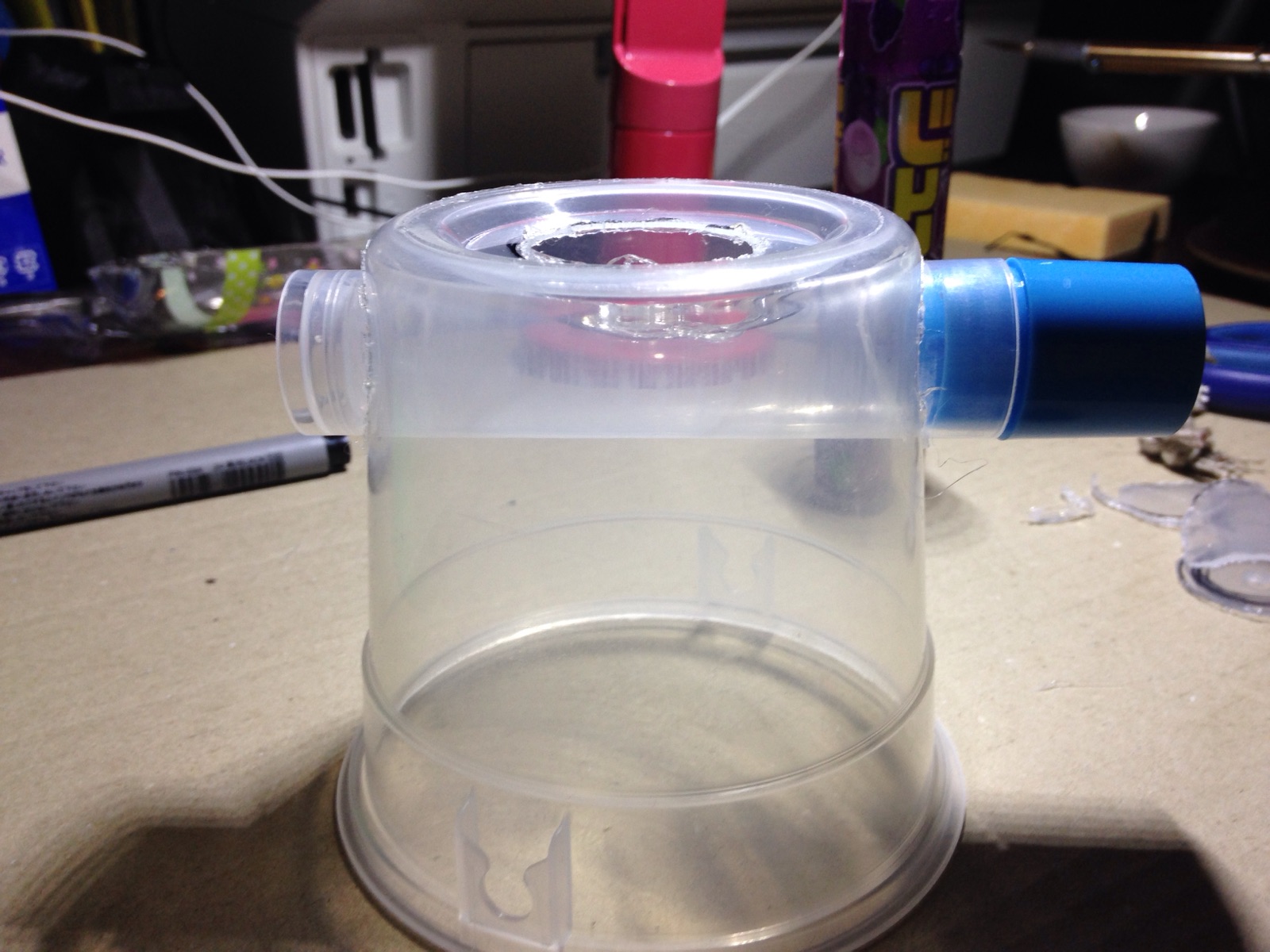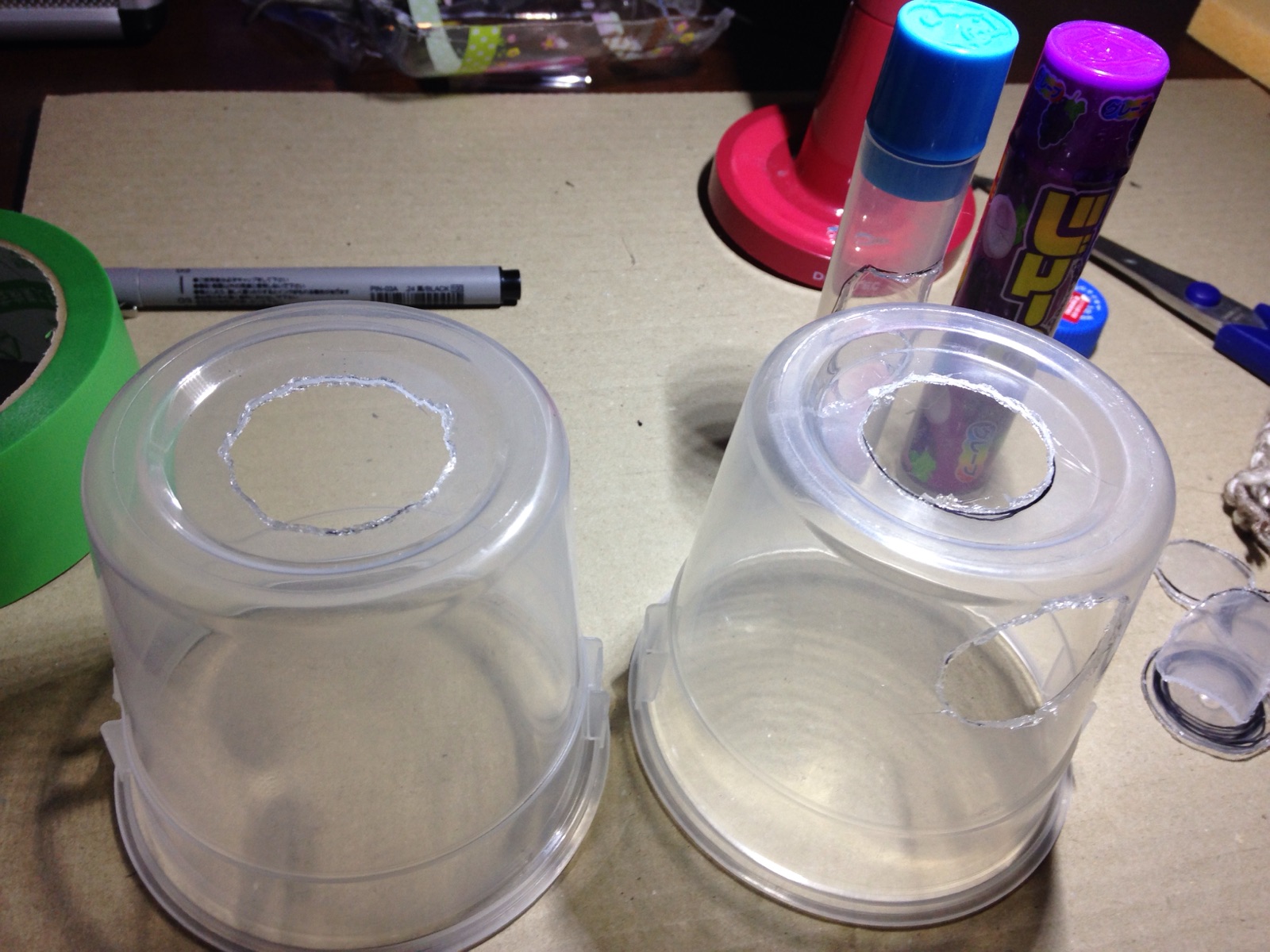 水道に見立てた ポンプの頭を入れる 穴をカッターで切る。